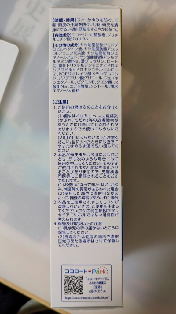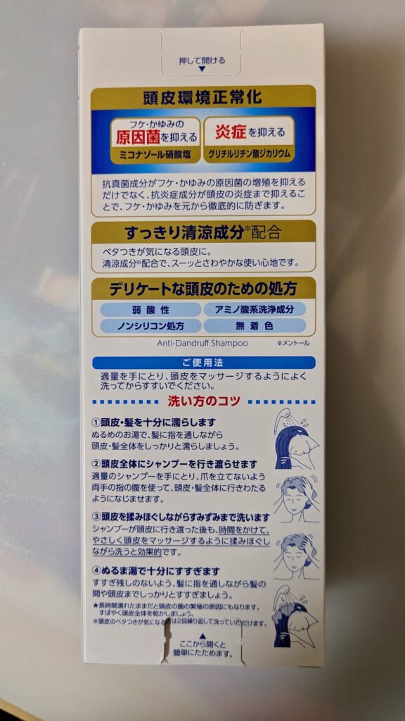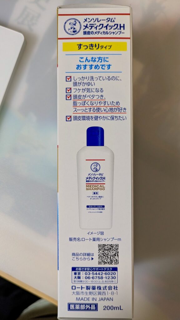 メディクイックH 頭皮のメディカルシャンプーは、フケ・かゆみの原因菌の増殖を抑える**抗真菌成分(ミコナゾール硝酸塩)と、炎症を抑える抗炎症成分(グリチルリチン酸ジカリウム)**を配合した薬用シャンプー(医薬部外品)です。コンディショニング成分配合により、これ一本でも髪がきしみにくい、ノンシリコン処方。弱酸性で、清涼成分(メントール)配合のさっぱりした使い心地です(すっきりタイプ)。 詳細はロート製薬公式サイトをご参照ください。